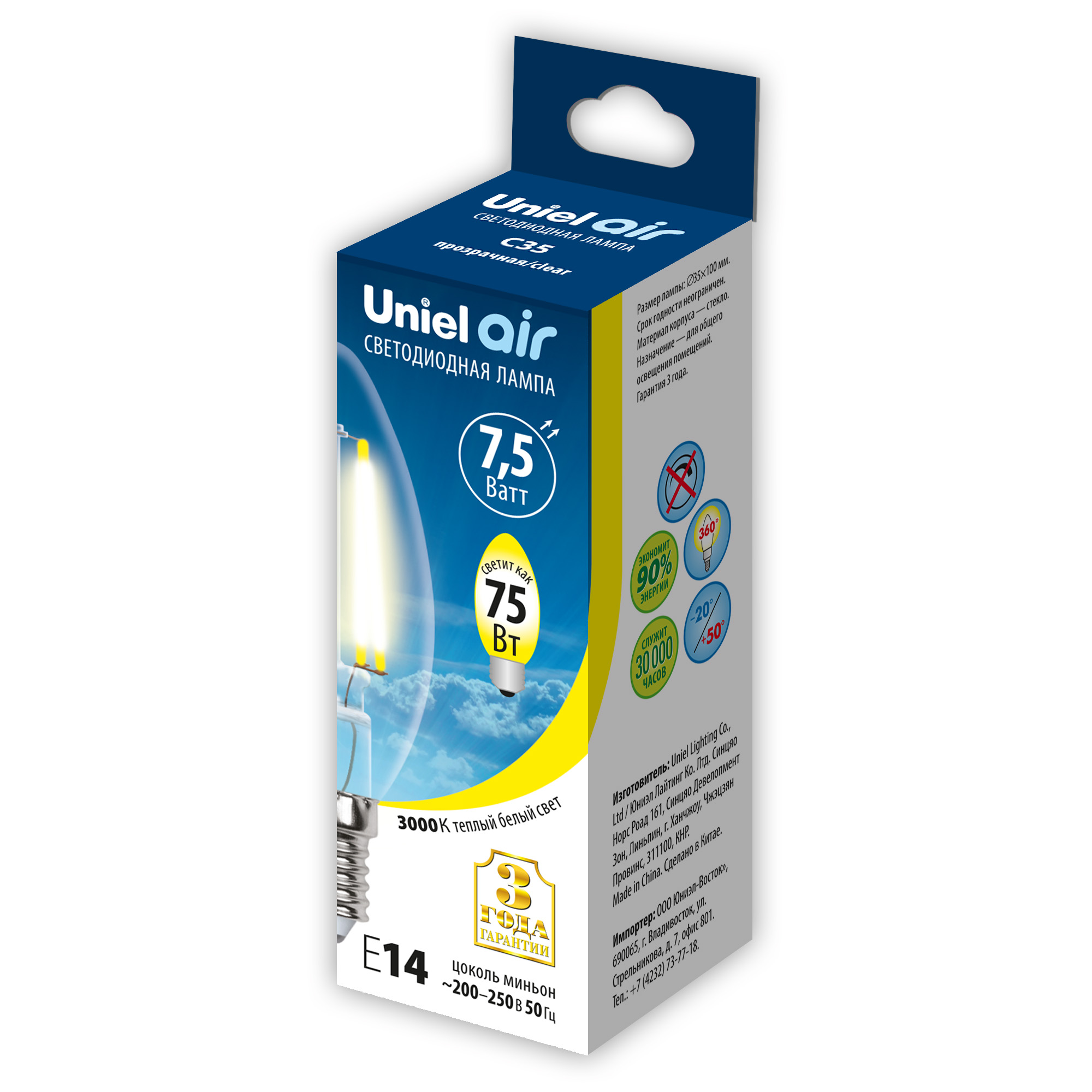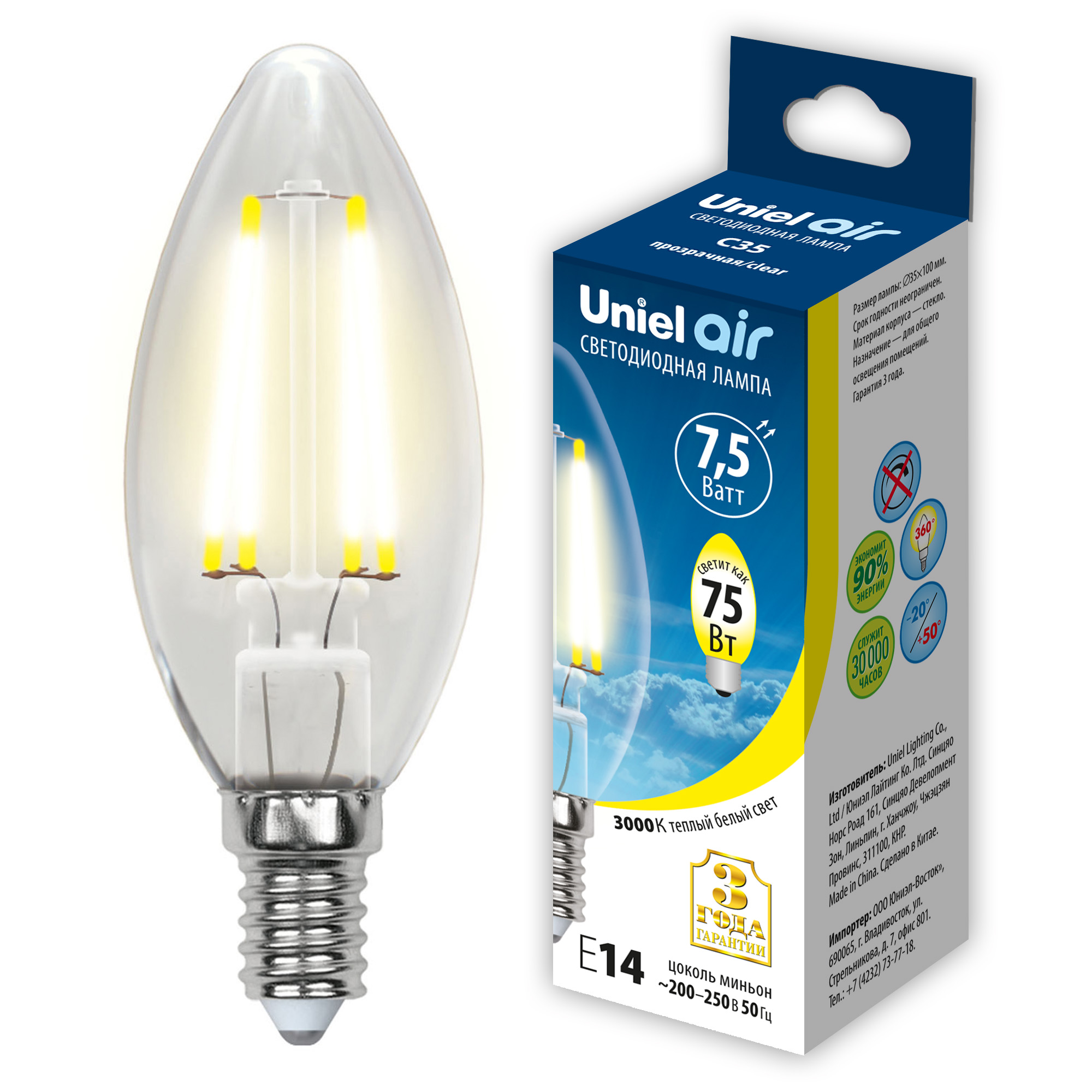 LED-C35-7.5W-WW-E14-CL GLA01TR Лампа светодиодная. Форма свеча. прозрачная. Серия Air. Теплый белый свет 3000K. Картон. ТМ Uniel