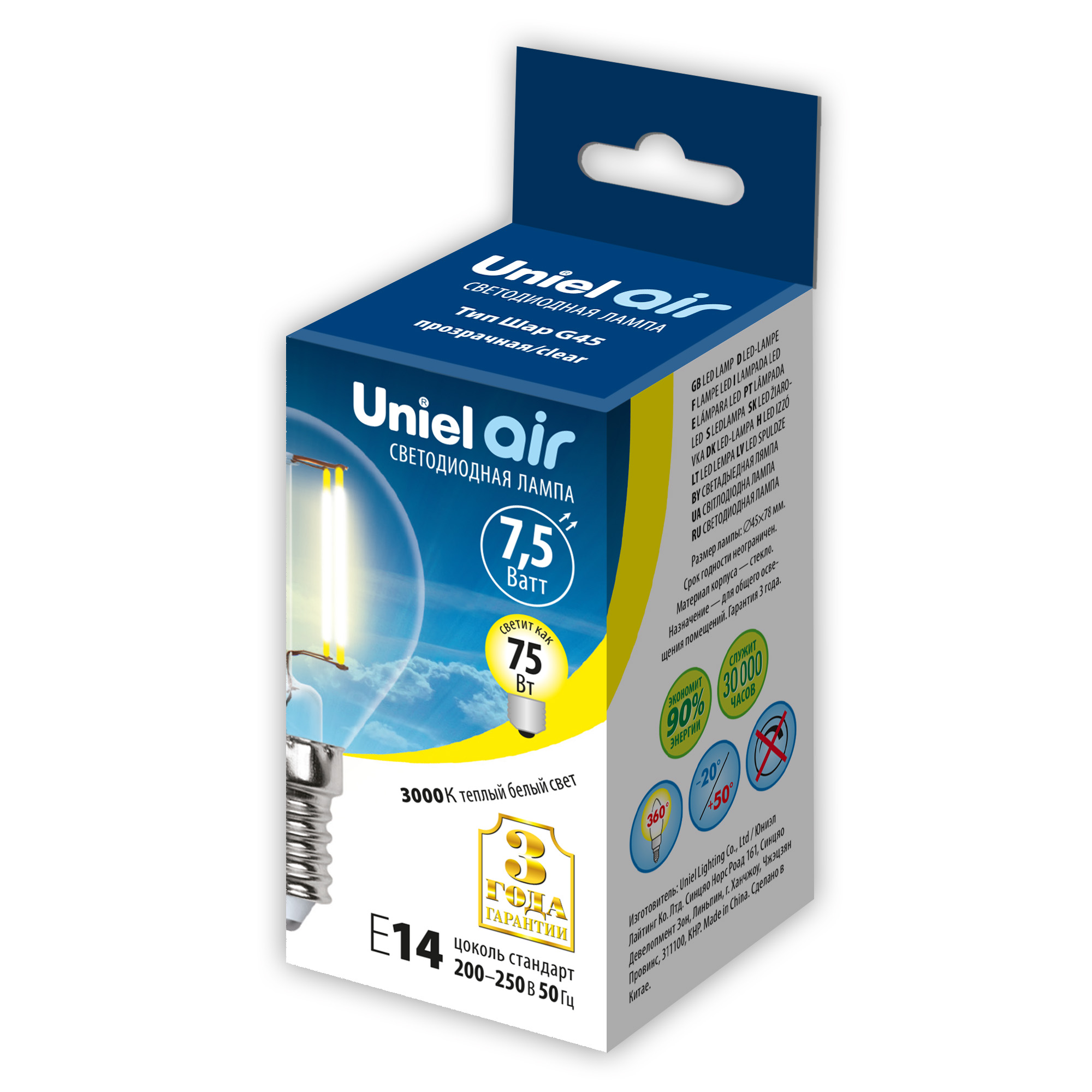 LED-G45-7.5W-WW-E14-CL GLA01TR Лампа светодиодная. Форма шар. прозрачная. Серия Air. Теплый белый свет 3000K. Картон. ТМ Uniel