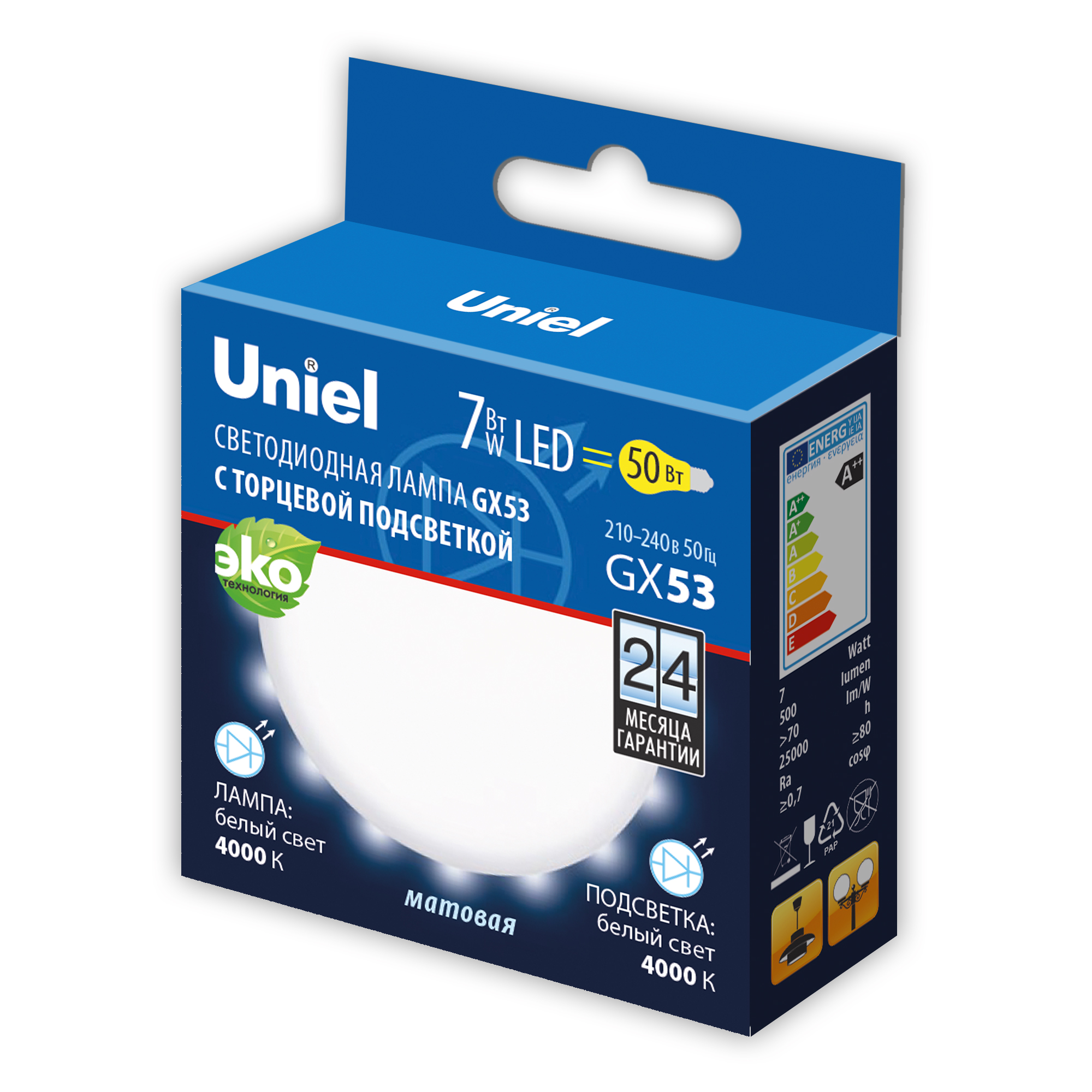 LED-GX53-7W-4000K+4000K-GX53-FR PLB02WH Лампа светодиодная. матовая. Белый свет 4000K. Торцевая подсветка. Белый свет 4000K. Картон. ТМ Uniel.