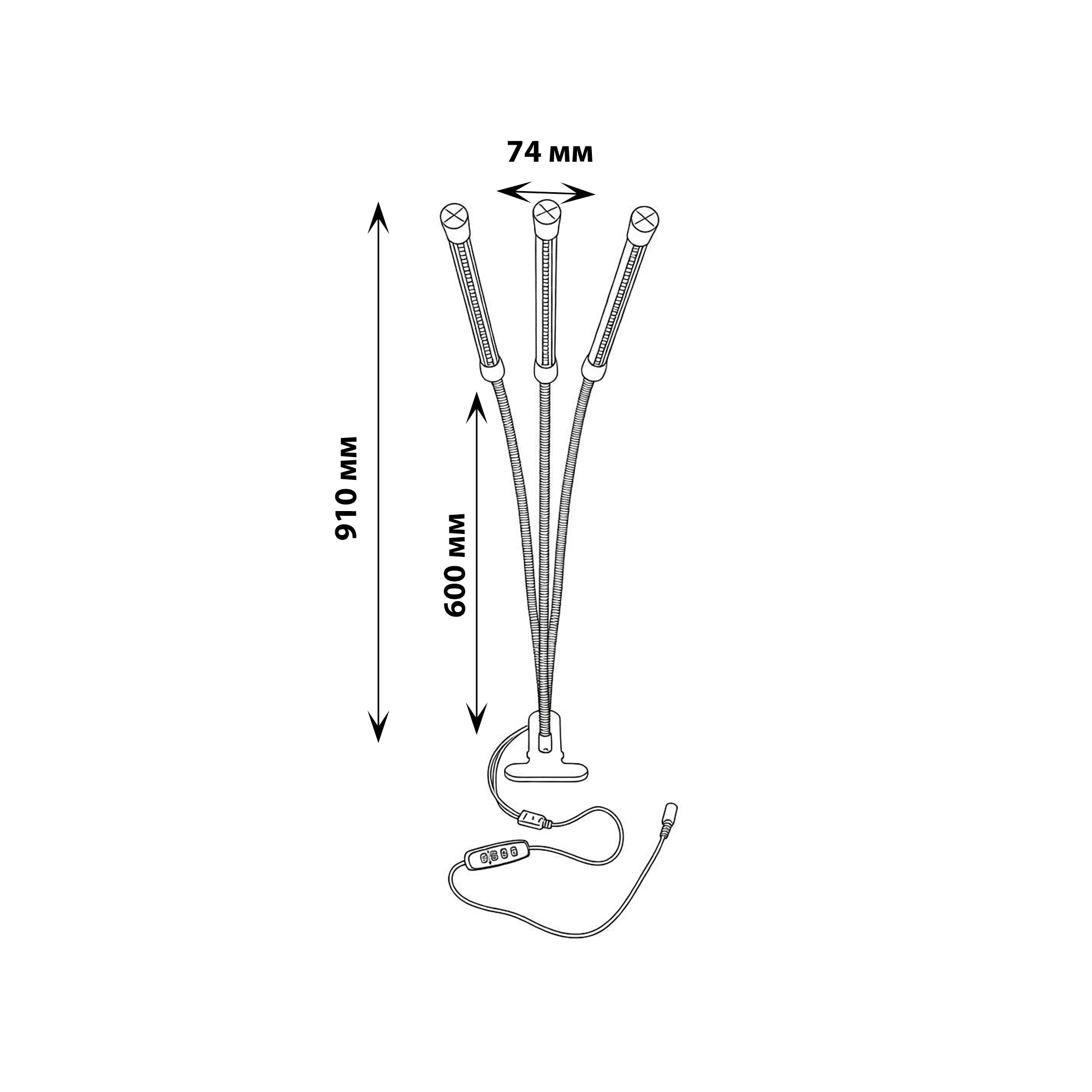 Светильник для растений светодиодный с таймером на прищепке ULT-P33-18W/SPLE/TM/60 IP40 WHITE TRIPLE от Uniel предназначен для освещения и досветки в помещениях декоративных растений, ароматных трав и рассады. Мягкое розовое свечение спектра SPLE повторяет спектр требующийся растениям для фотосинтеза. Основные особенности модели: три световых плафона на гибких ножках, встроенный диммер для регулировки яркости свечения, таймер включения/выключения, крепление-прищепка и блок питания. Благодаря гибким ножкам, свет фитоламп легко направлять в нужные стороны в пределах 360°. С помощью удобной прищепки светильник для растений легко закрепить на любой поверхности. Размер настольного фитосветильника 111х74х910 мм, вес 910 г. Срок службы светильника светодиодного - 30 000 часов. Длинный шнур питания - 1,8 метра. Гарантия на настольный светильник составляет 2 года.